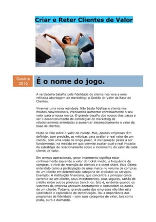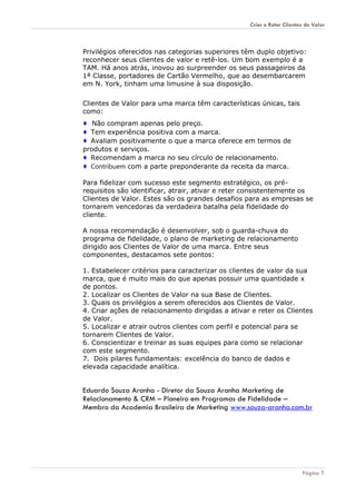 O documento discute a importância da gestão do valor da base de clientes como uma estratégia de marketing fundamental para aumentar a fidelidade e retenção dos clientes de valor. Destaca a necessidade de métricas precisas para avaliar o impacto das estratégias de relacionamento e sugere um plano de marketing de fidelidade com sete componentes essenciais. Enfatiza que entender e ativar clientes de valor é crucial para o sucesso das empresas na batalha pela fidelidade do cliente.