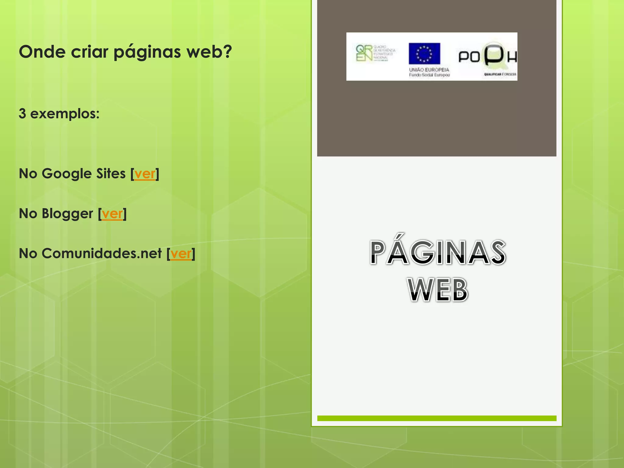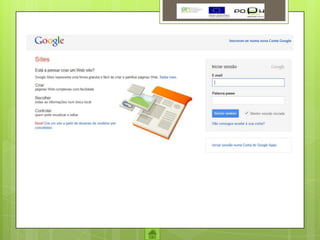 Este documento fornece 3 opções para criar páginas web: o Google Sites, o Blogger e o Comunidades.net, e dá exemplos de páginas criadas nessas plataformas como Caricaturas, Geração Benfica e Espaço da Arte.