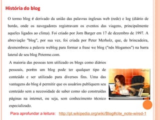 O documento discute a história dos blogs, suas vantagens e como criar e administrar um blog de forma gratuita utilizando o serviço Blogger. Ele explica os passos para criar uma conta no Blogger, criar um blog, publicar postagens, inserir imagens, vídeos e outros elementos.