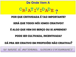 O documento discute a importância da criatividade e como ela pode ser cultivada. Apresenta quatro elementos essenciais para o espírito criativo: abertura, tolerância, animo e curiosidade. Também discute blocios mentais como medo de cometer erros que podem limitar a criatividade e enfatiza que a criatividade pode ser desenvolvida através do esforço contínuo de adquirir novos conhecimentos e ter curiosidade sobre o mundo.