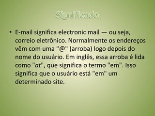 O documento explica a origem e evolução do email. Começou em 1971 como uma forma de trocar mensagens simples na ARPANET e foi desenvolvido pelo programador Ray Tomlinson, que adotou o símbolo "@" para identificar remetentes e destinatários. Atualmente o email é amplamente usado para comunicação rápida no trabalho, estudo e lazer.