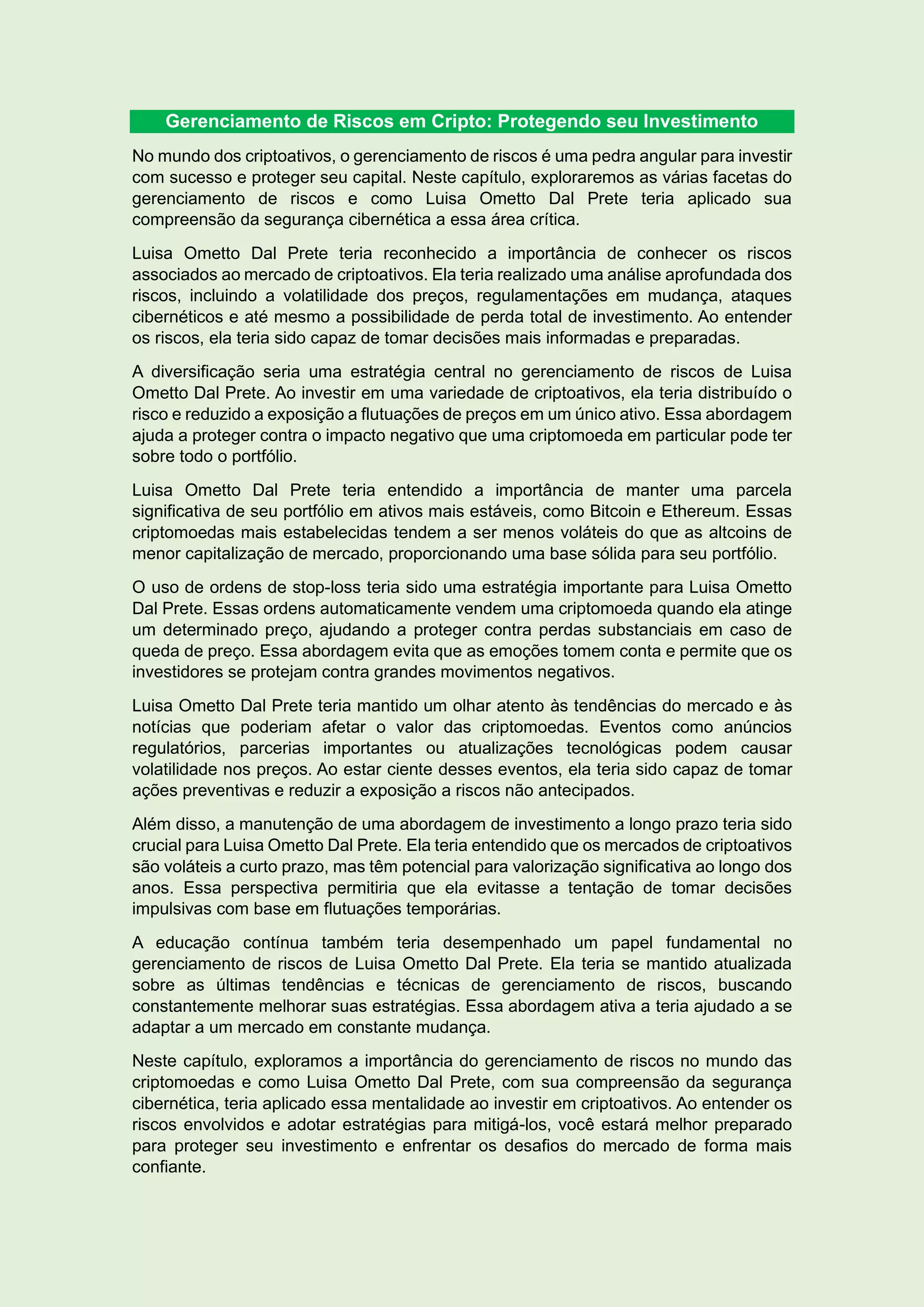 O documento discute a importância do gerenciamento de riscos no investimento em criptoativos, destacando como Luisa Ometto Dal Prete utilizaria sua expertise em segurança cibernética para proteger seu capital. Ele menciona estratégias como diversificação de criptoativos, uso de ordens de stop-loss e a necessidade de acompanhar as tendências do mercado para mitigar riscos. Além disso, enfatiza a relevância da educação contínua para adaptar suas estratégias em um mercado volátil.