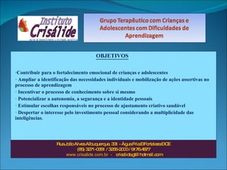 O documento descreve os objetivos, funcionamento e coordenação de um programa psicológico para crianças e adolescentes chamado Crisalide localizado em Fortaleza, Brasil. O programa tem duração de 8 meses com encontros semanais e visa fortalecer emocionalmente os participantes e estimular sua autonomia e identidade pessoal. É coordenado por Meire Nunes Viana e envolve avaliação psicológica inicial e sessões de grupo terapêutico semanais.
