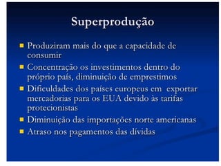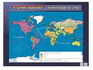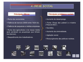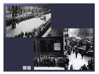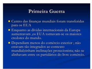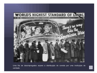 Após a Primeira Guerra Mundial, os Estados Unidos emergiram como potência vitoriosa e próspera. Entre 1919-1929, os EUA desfrutaram de um período de crescimento econômico e industrial, com aumento do consumo. No entanto, em 1929, uma queda acentuada nos preços das ações deu início à Grande Depressão, levando à falência de bancos e empresas, e ao desemprego de milhões.