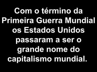 Após a Primeira Guerra Mundial, os Estados Unidos se tornaram o maior credor mundial ao conceder empréstimos para a reconstrução da Europa. No entanto, a economia americana entrou em crise a partir de 1925 devido à superprodução e à concorrência européia recuperada. Isto levou ao crash da Bolsa de Valores de Nova York em 1929, espalhando a Grande Depressão globalmente. O presidente Franklin Roosevelt tentou resolver a crise nos EUA por meio do New Deal, que incluiu obras públicas e intervenção estatal na economia