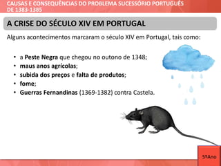 A crise do século XIV em Portugal levou à disputa sucessória após a morte de D. Fernando I. D. Leonor Teles e João I de Castela apoiaram D. Beatriz, mas D. João, Mestre de Avis liderou a resistência e foi aclamado rei após vitórias sobre os castelhanos em Atoleiros e Aljubarrota. Sua aclamação estabeleceu a independência de Portugal.