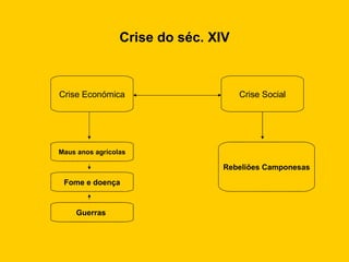 No século XIV, a Europa enfrentou uma grave crise econômica e social devido a maus anos agrícolas que causaram fome e doenças como a Peste Negra. Em Portugal, esta crise levou a revoltas populares contra a coroa e o casamento da rainha D. Beatriz com João de Castela. Em 1383, D. João, Mestre de Avis liderou um golpe que o levou ao poder com apoio do povo e parte da nobreza e clero, iniciando a independência de Portugal.