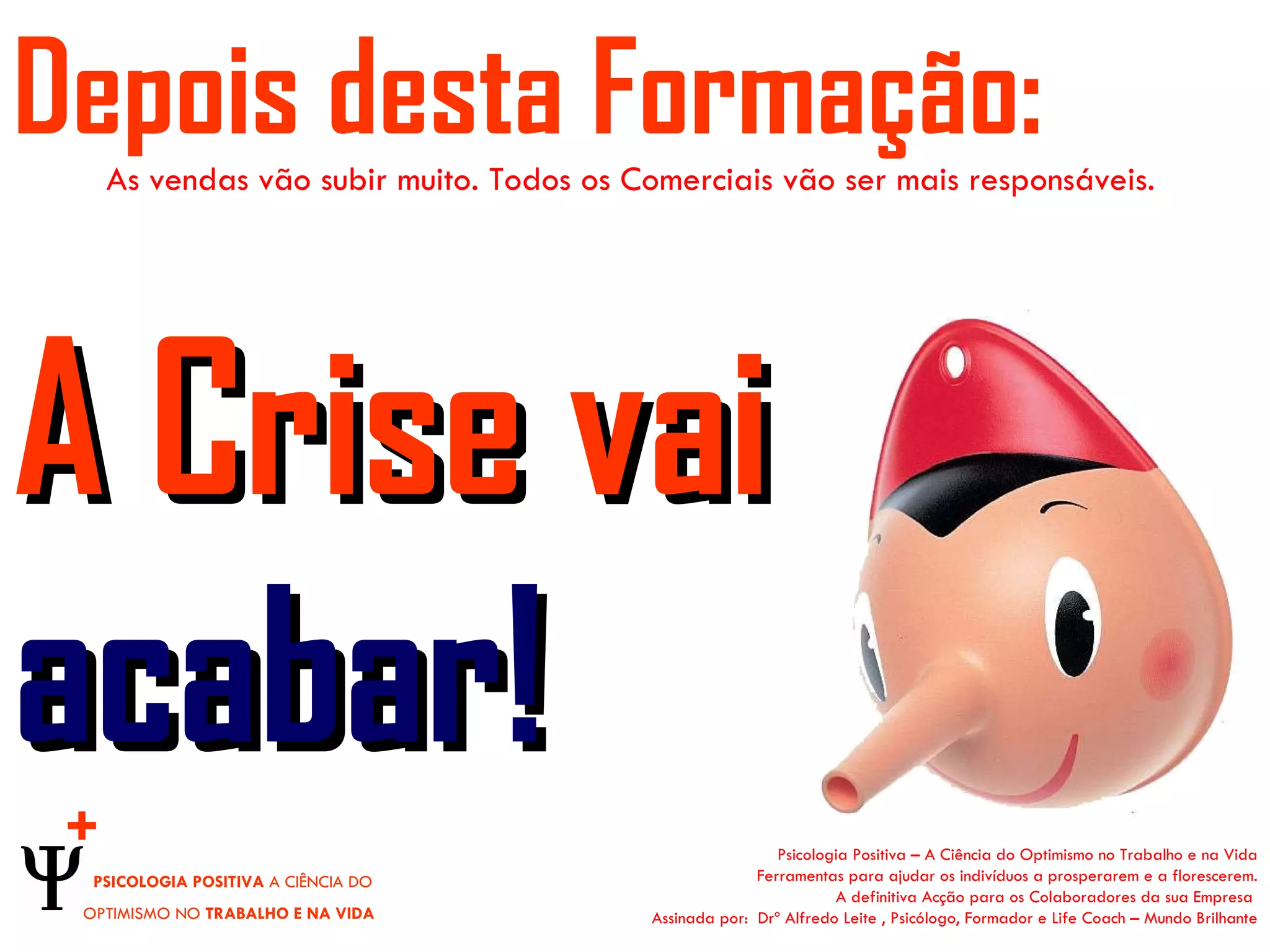 O documento propõe um workshop de psicologia positiva focado em otimizar o desempenho e morale dos colaboradores em momentos de crise, ministrado pelo psicólogo Alfredo Leite. A formação visa oferecer ferramentas práticas para ajudar pessoas a prosperarem, transformando a negatividade em ações positivas. A proposta é inovadora e busca transformar a dinâmica de trabalho através do otimismo.