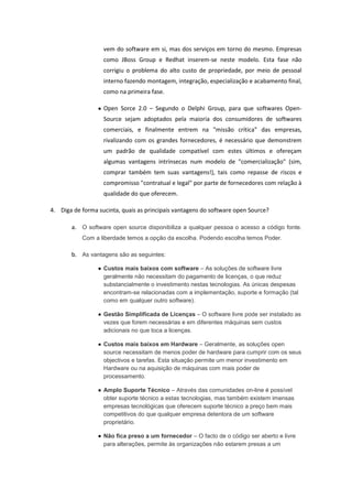 Este documento discute software de código aberto, incluindo suas definições, principais fases de evolução e vantagens. Aborda o significado de software livre versus código aberto, exemplos de projetos de sucesso e o objetivo do repositório OSOR de compartilhar aplicativos de código aberto entre estados membros.