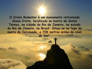 1. O Cristo Redentor é um monumento de Jesus Cristo localizado no Rio de Janeiro, no topo do morro do Corcovado.