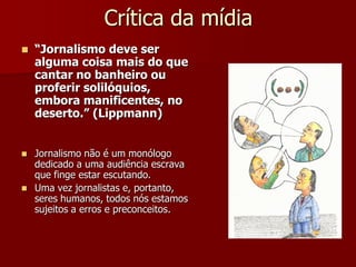 O documento discute o papel da mídia e do jornalismo na sociedade, argumentando que a mídia deve ajudar a definir a cultura de uma comunidade, identificar seus interesses e necessidades, e ampliar as conversas entre as pessoas. Também destaca que os observatórios de mídia, como o Núcleo de Estudos sobre Mídia e Política, servem para fiscalizar a imprensa e garantir que ela cumpra seu papel de forma responsável e informada.