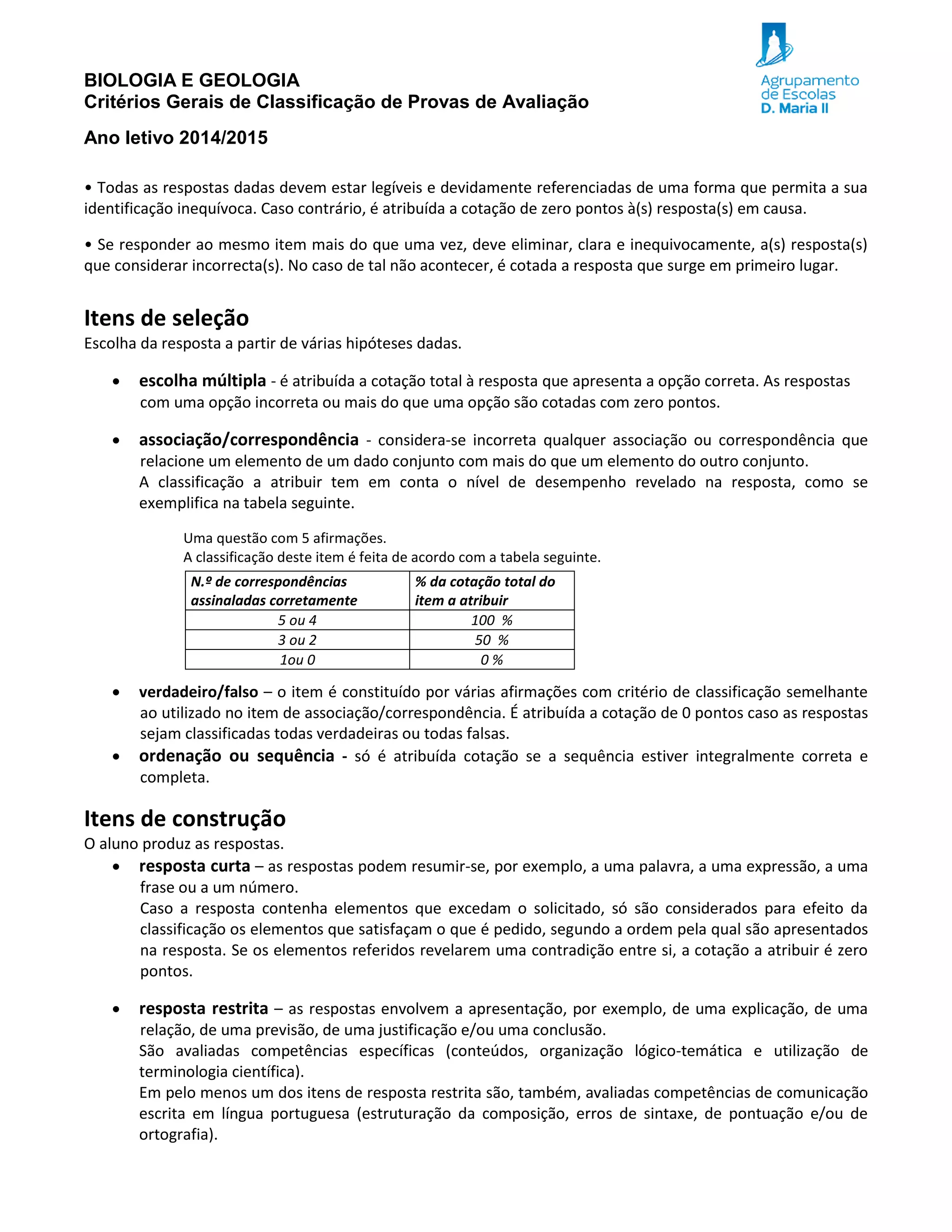 Este documento fornece critérios gerais para a classificação de provas de avaliação em Biologia e Geologia. Ele define regras para diferentes tipos de itens como escolha múltipla, associação, verdadeiro/falso e resposta restrita, e como serão cotados com base no número de respostas corretas. As respostas devem estar legíveis e referenciadas, e se houver mais de uma resposta a um item, deve ser claramente indicada qual é a resposta correta.