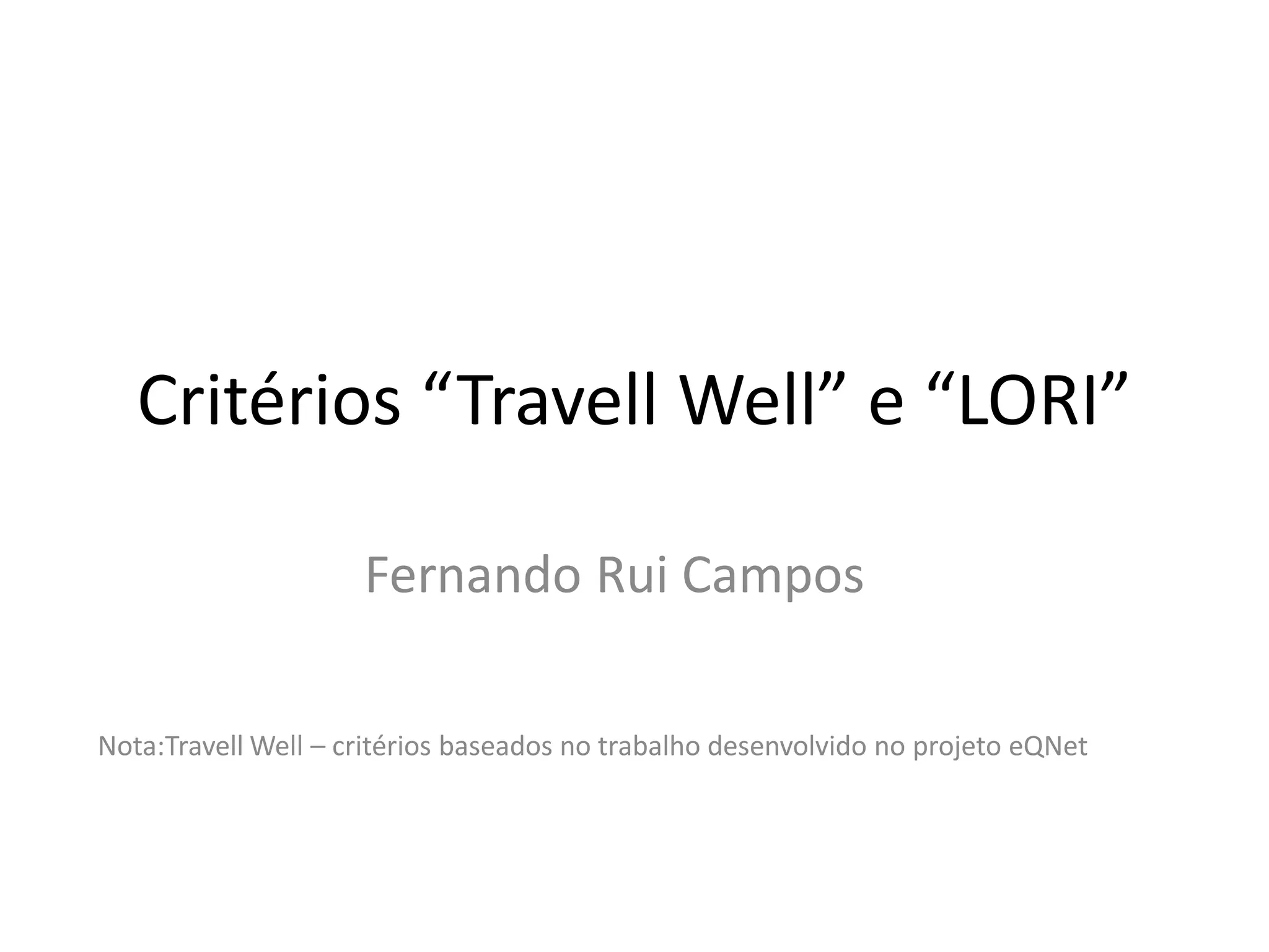 Este documento discute critérios para avaliar a qualidade de recursos digitais, como "Travell Well" e "LORI". Ele fornece detalhes sobre os critérios "Bons viajantes" do projeto Travell Well e lista recursos relacionados a modelos de qualidade, incluindo o portal europeu LRE e documentos sobre avaliação de objetos de aprendizagem.