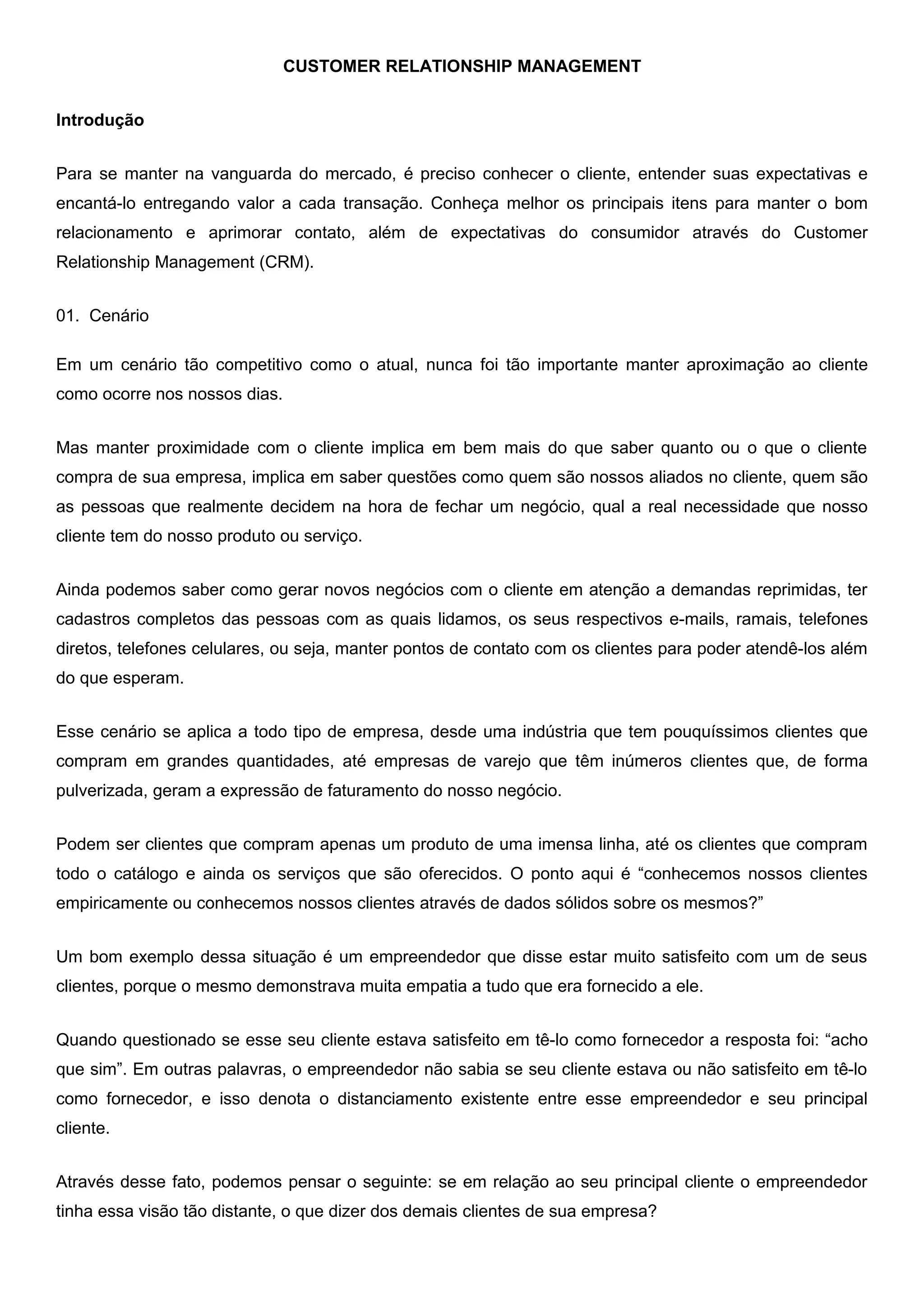 O documento discute a importância do Customer Relationship Management (CRM) para empresas