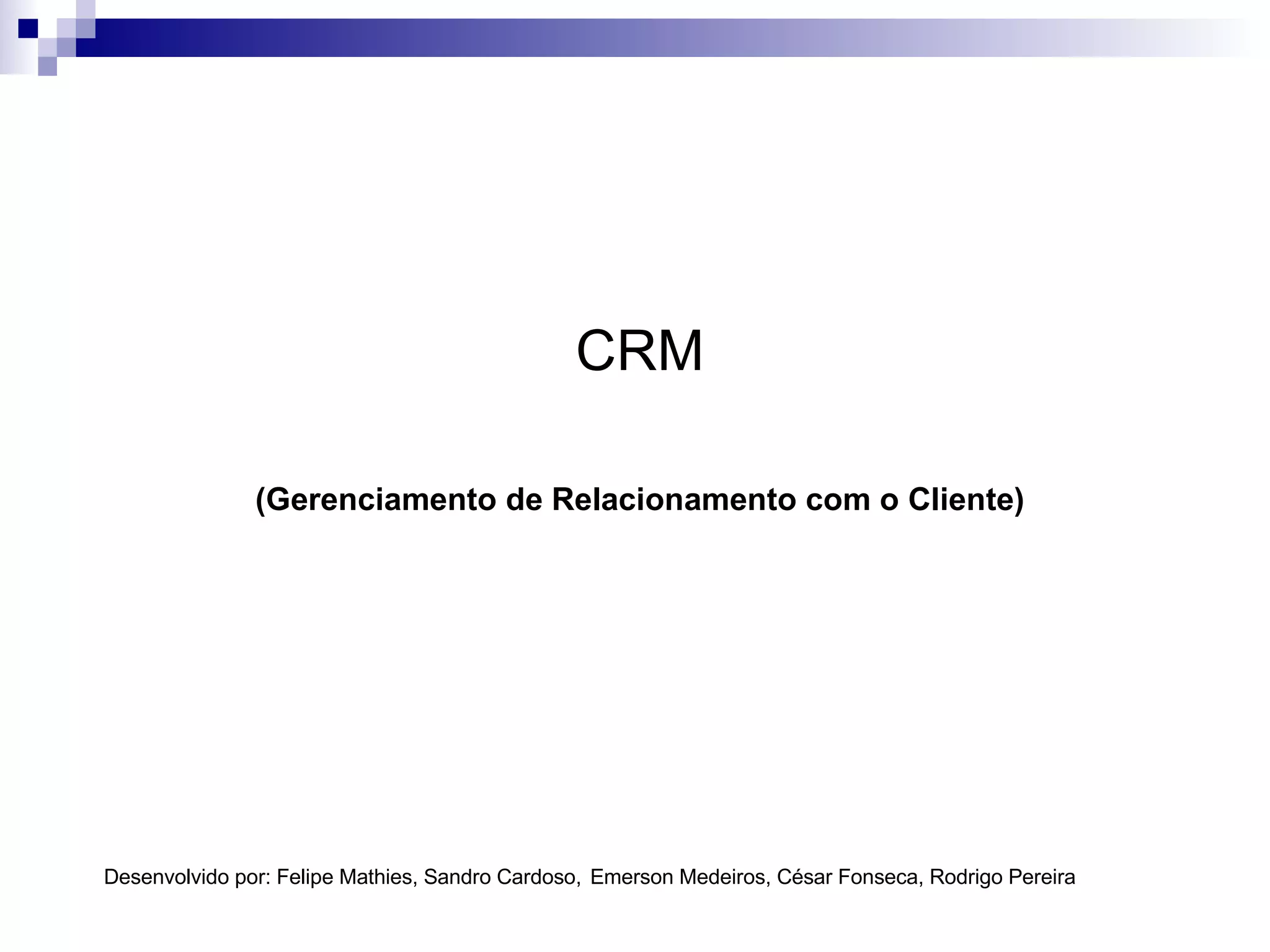 O documento discute o que é CRM, suas funcionalidades principais e casos de sucesso de empresas que utilizam CRM. Algumas soluções de CRM são apresentadas, como o SAP CRM, Plusoft 5 CRM e S-Mark, com suas características descritas.