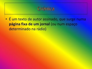 Este documento discute as características de uma crônica jornalística, definindo-a como um texto assinado que aborda assuntos do cotidiano com reflexão e subjetividade, apresentando um olhar pessoal sobre a realidade de forma leve, polêmica, irônica ou humorística por meio de uma linguagem cuidadosa e literária.