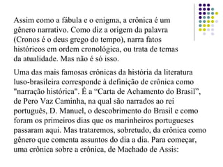 A crônica é um gênero narrativo que narra fatos históricos em ordem cronológica ou trata de temas da atualidade. Uma das mais famosas crônicas é a "Carta de Achamento do Brasil" que narra o descobrimento do Brasil. A crônica moderna comenta assuntos do dia a dia de forma analítica e emocional.