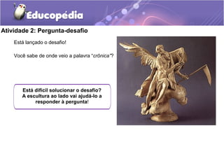 O documento apresenta 16 atividades sobre o gênero textual crônica, abordando sua definição, tipos, características e orientações para produção de uma crônica-conto. As atividades incluem vídeos, exemplos e discussões para compreensão do gênero, culminando na escrita e revisão de uma crônica produzida pelos alunos.