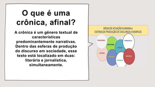 O documento fornece um resumo sobre o gênero da crônica, discutindo suas características, origens e exemplos de autores brasileiros renomados que cultivaram o gênero, como Rubem Braga, Stanislaw Ponte Preta e Luís Fernando Veríssimo.