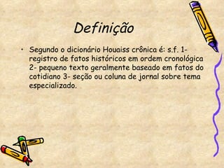 O documento define crônica como um gênero literário que relata fatos contemporâneos de forma direta e reflexiva. Discute as origens e classificações da crônica, e como a Carta de Pero Vaz de Caminha é considerada a primeira crônica brasileira por registrar os fatos da descoberta do Brasil de forma concreta e essencial. O documento argumenta que a crônica é um gênero apropriado para o ensino por despertar o prazer da leitura e abordar temas do cotidiano de