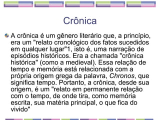 O documento descreve o gênero discursivo da crônica, seu desenvolvimento no Brasil e suas principais características. A crônica surgiu como um relato cronológico de fatos históricos, mas no Brasil consolidou-se como gênero literário a partir de 1930, graças a escritores como Rubem Braga e Luís Fernando Veríssimo. As crônicas costumam ser curtas, narradas em primeira pessoa e abordar fatos cotidianos de forma pessoal e leve, podendo ser descritivas, narrativ