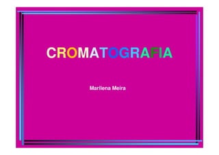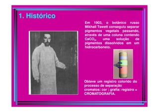 A cromatografia foi desenvolvida em 1903 por Mikhail Tswett para separar pigmentos vegetais. É um método físico-químico de separação baseado na migração diferencial dos componentes de uma mistura devido a diferentes graus de interação entre duas fases imiscíveis, uma móvel e outra fixa. Existem vários tipos de cromatografia classificados pela fase móvel, fase estacionária e modo de separação, como cromatografia líquida, gasosa e por exclusão, adsorção, partição ou troca