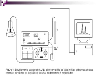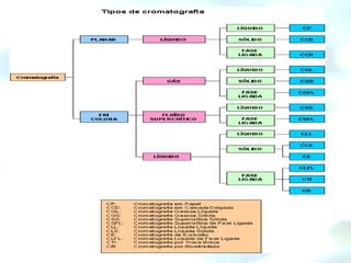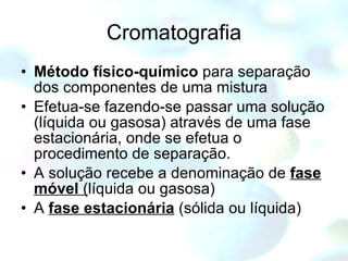 A cromatografia é um método físico-químico para separar os componentes de uma mistura, fazendo-a passar através de uma fase estacionária. Os principais métodos são a cromatografia em papel, camada delgada, gasosa e líquida de alta eficiência. A cromatografia em camada delgada usa placas de vidro ou sílica como fase estacionária para separar compostos por suas diferentes afinidades.