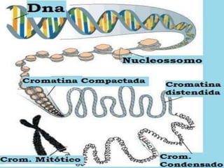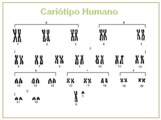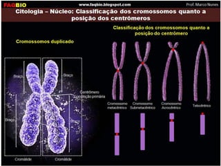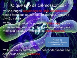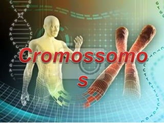 Cromossomos são longas sequências de DNA condensadas que contêm genes. Eles são formados por proteínas e DNA e ajudam na divisão celular. Cromossomos possuem regiões que delimitam estruturas como centrômeros e nucléolos. As células somáticas são diploides com pares de cromossomos iguais, enquanto células reprodutivas são haploides com um de cada tipo. O conjunto de cromossomos define o genoma e cariótipo de cada espécie.