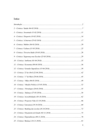 [1] O documento é uma coletânea de 25 crônicas escritas por Rui Cardoso entre janeiro e novembro de 2010 para a Rádio Portalegre. [2] As crônicas abordam diversos temas de interesse local e nacional como educação, saúde, juventude, esporte, internet, mulheres, cultura, terceira idade e economia. [3] A coletânea foi organizada e introduzida por Paulo Cardoso, irmão de Rui, que elogia o desempenho de Rui como cron