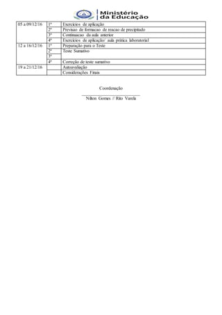 O cronograma detalha o plano de estudos do 12o ano de Química durante o 1o trimestre, cobrindo tópicos como fórmulas químicas, gases ideais, equilíbrio químico e solubilidade. As aulas incluem apresentações, exercícios e dois testes para avaliar o progresso dos alunos.
