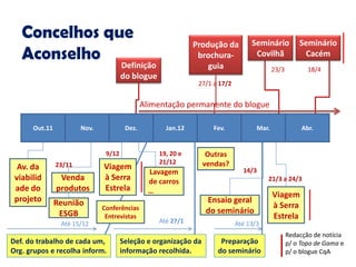 O documento apresenta um cronograma de atividades para um projeto que inclui a criação de um blogue e seminários. As principais atividades são a definição do blogue entre janeiro e fevereiro, um seminário em Covilhã em março e outro em Cacém em abril, e a alimentação contínua do blogue entre outubro e abril.