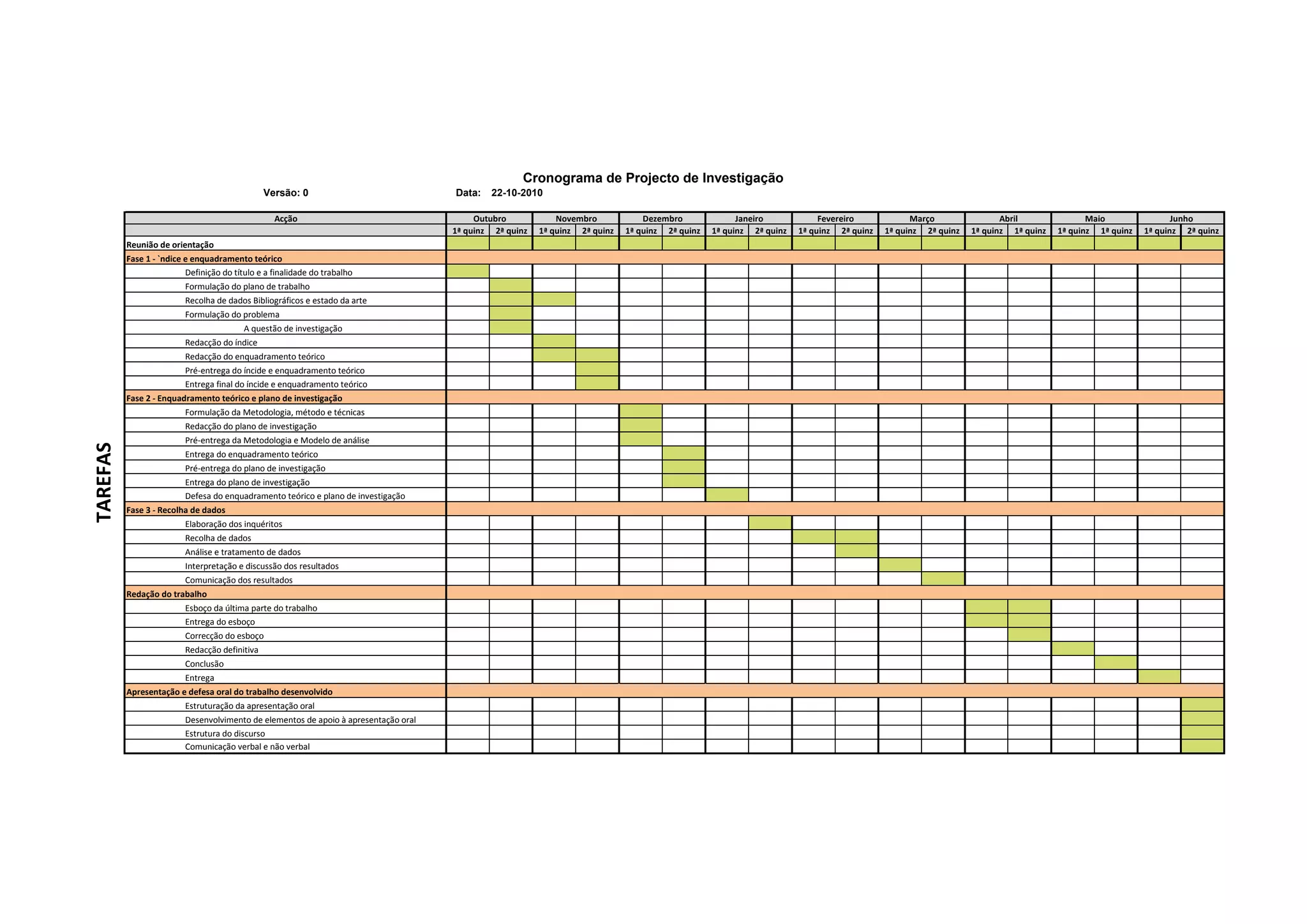 Este documento apresenta um cronograma detalhado para um projeto de investigação dividido em três fases principais: 1) Índice e enquadramento teórico, 2) Enquadramento teórico e plano de investigação, e 3) Recolha de dados. A primeira fase inclui a definição do título e objetivos, revisão bibliográfica, e redação do índice e enquadramento teórico. A segunda fase abrange a metodologia, plano de investigação e sua defesa. A terceira fase é dedicada à