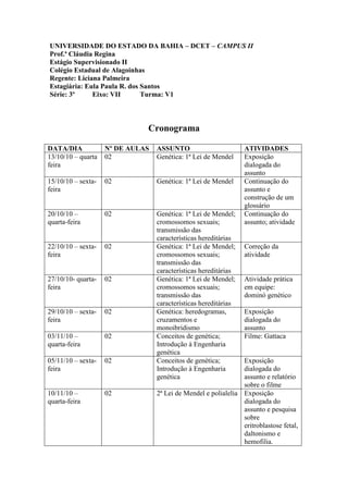 O cronograma planeja 12 aulas sobre genética, ecologia e meio ambiente. As aulas abordarão tópicos como as leis de Mendel, cromossomos sexuais, cadeias alimentares, sucessão ecológica, degradação ambiental e desenvolvimento sustentável. Atividades como exposições dialogadas, filmes, pesquisas e construção de cartazes serão realizadas.