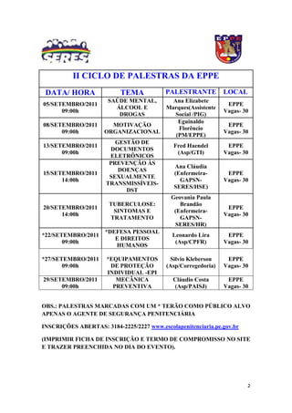 O documento descreve o cronograma do II Ciclo de Palestras da Escola Penitenciária de Pernambuco (EPPE), com datas, horários, temas e palestrantes de agosto a setembro de 2011, com foco em desafios do sistema penitenciário, laudos periciais, educação corporativa, gestão da informação, inteligência e prevenção ao tráfico de drogas, saúde mental, motivação, doenças sexualmente transmissíveis e outros temas relevantes ao sistema penitenciário.