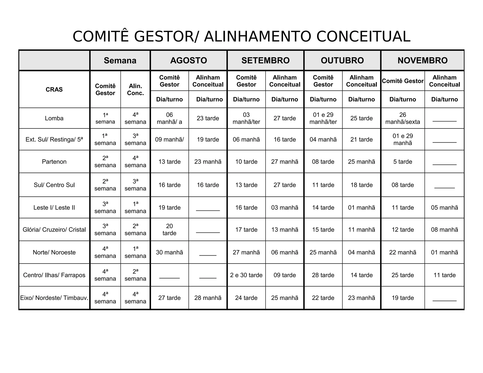 O documento descreve a programação de reuniões do Comitê Gestor e Alinhamento Conceitual nos CRAS da cidade para os meses de agosto a dezembro. Ele lista os nomes dos CRAS e as semanas em que serão realizadas as reuniões, bem como os dias da semana e horários.