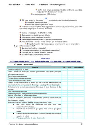 O documento apresenta o plano de estudo semanal de uma turma de Medicina/Engenharia, com o horário de estudos diário e avaliações semanais. Inclui também recomendações sobre como organizar as sessões de estudo de forma eficiente.