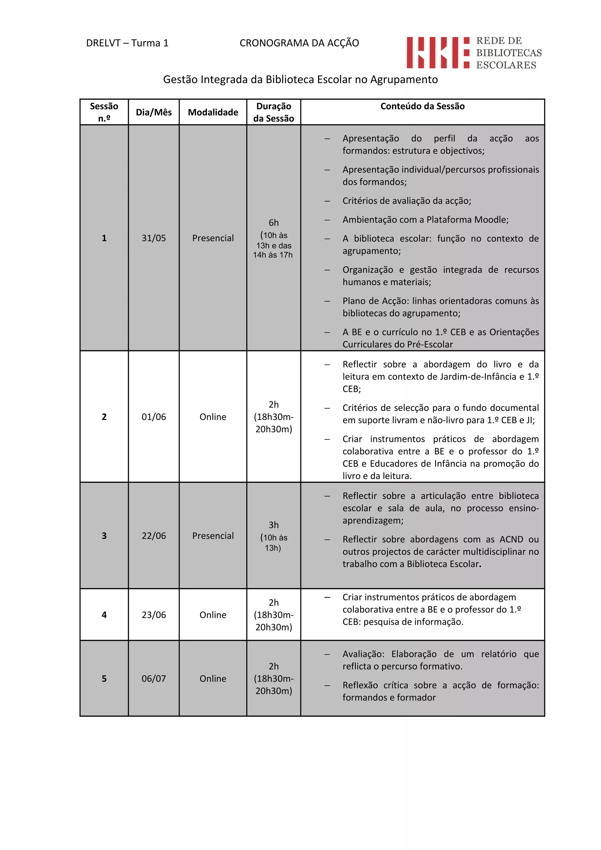 O cronograma apresenta um plano de formação de 5 sessões sobre a gestão integrada da biblioteca escolar. A formação abordará tópicos como a função da biblioteca no contexto escolar, organização de recursos, plano de ação comum, articulação com o currículo e promoção da leitura. As sessões serão presenciais e online e incluirão atividades práticas e avaliação.