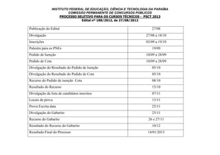 O documento resume as principais datas e etapas do Processo Seletivo para os Cursos Técnicos do Instituto Federal da Paraíba em 2013, incluindo período de inscrições de 3 de setembro a 19 de outubro, data da prova escrita em 25 de novembro, e divulgação do resultado final em 14 de janeiro de 2013.
