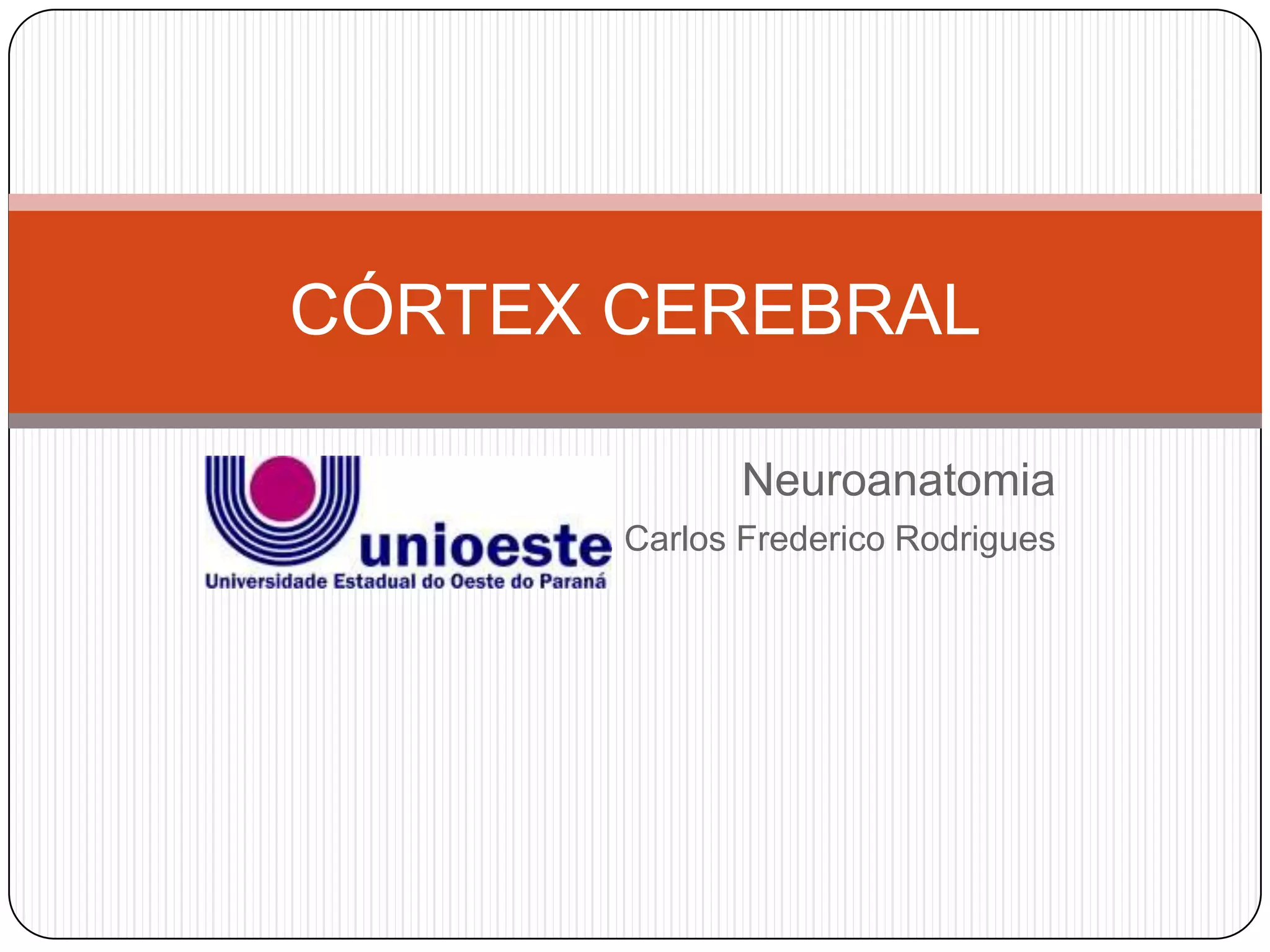 O documento descreve a anatomia e classificações do córtex cerebral. O córtex é constituído por uma camada de substância cinzenta com sulcos e giros que aumentam sua superfície sem aumentar o volume craniano. É dividido em 6 camadas com diferentes tipos de células. Existem várias classificações do córtex, incluindo anatômica, citoarquitetural e funcional, dividindo-o em áreas de projeção, associação e límbicas.