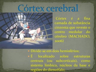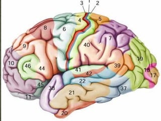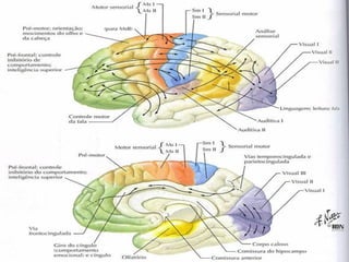O documento descreve as principais divisões anatômicas, filogenéticas, estruturais e funcionais do cérebro, incluindo a divisão em lobos, áreas de projeção e associação, e a classificação de Brodmann de 52 áreas corticais.