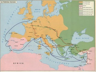 As Cruzadas foram uma série de campanhas militares entre os séculos XI e XIII lideradas por cristãos europeus com o objetivo de recuperar os lugares santos na Palestina, como Jerusalém, das mãos dos muçulmanos. Houve oito cruzadas oficiais no total, começando com a Primeira Cruzada que conquistou Jerusalém em 1099 e estabelecendo Estados Cruzados no Oriente Médio, embora muitas das conquistas foram posteriormente perdidas para os muçulmanos, como Saladino.