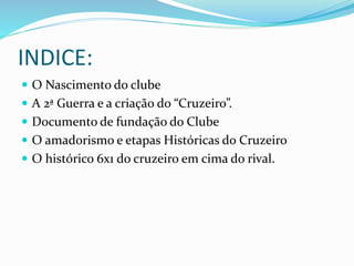 O documento resume a história do Cruzeiro Esporte Clube, desde sua fundação como Societá Sportiva Palestra Itália em 1921 até conquistas importantes. Devido à Segunda Guerra Mundial, o clube teve que mudar seu nome para Cruzeiro Esporte Clube em 1942. O Cruzeiro conquistou muitos títulos nacionais e internacionais, como duas Copas Libertadores, e é reconhecido por revelar grandes talentos do futebol.