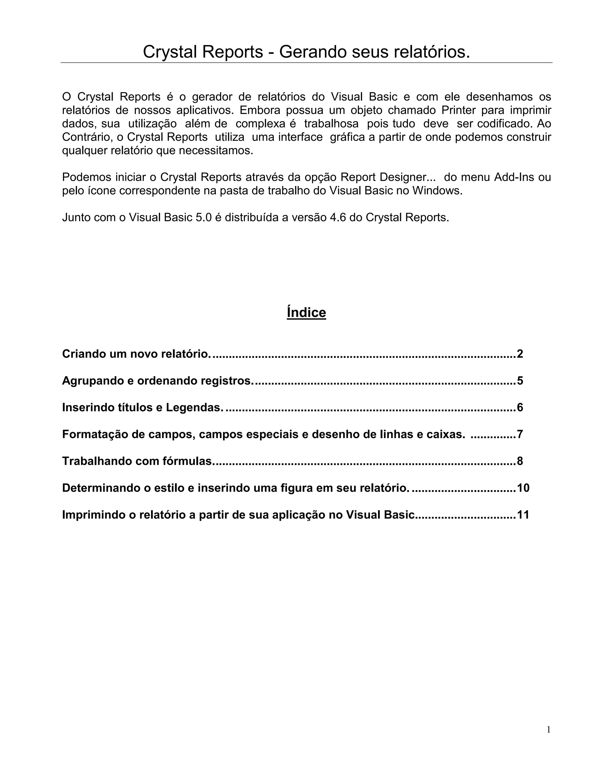 1) O documento discute como gerar relatórios no Crystal Reports a partir de dados em uma base de dados no Visual Basic.
