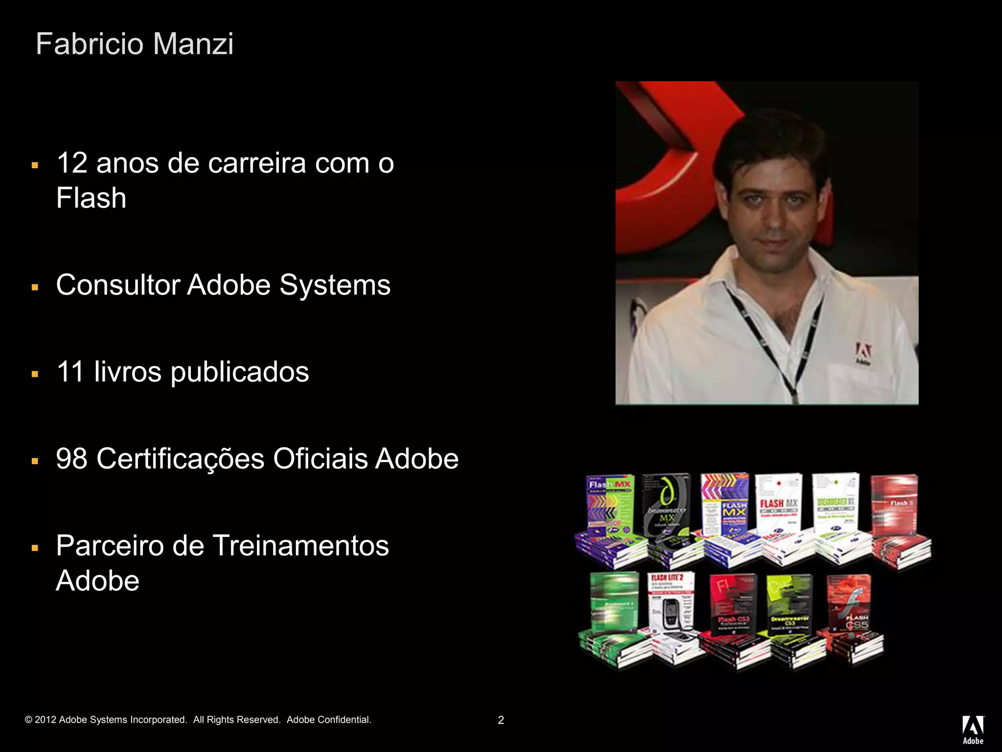 O documento apresenta Fabricio Manzi, consultor da Adobe Systems Brasil, e discute as novidades do Flash Professional CS6 e da Creative Cloud da Adobe, incluindo recursos para publicação multiplataforma, geração de sprite sheets, melhorias de desempenho e suporte para HTML5.