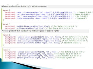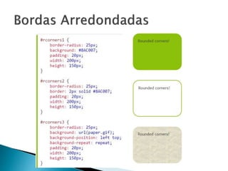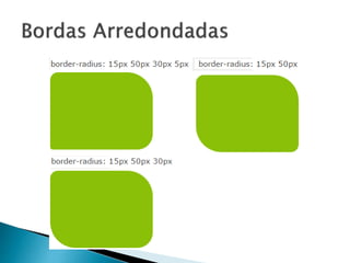 O documento discute as principais características da especificação CSS3, incluindo seletores aprimorados, novas propriedades para caixas, bordas, fundos e textos. Apresenta os módulos mais importantes de CSS3 e explica recursos como imagens de fundo múltiplas, valores de cor RGBA, gradientes, sombras, transições e layouts de múltiplas colunas.