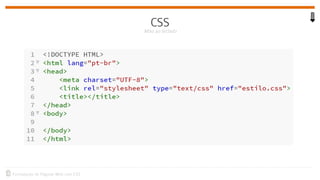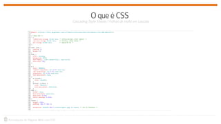 O documento descreve Cascading Style Sheets (CSS), um padrão para estilizar elementos HTML mantido pelo W3C desde 1996. CSS permite separar a formatação visual da estrutura do conteúdo, facilitando a manutenção de páginas e maior flexibilidade na apresentação dos documentos em diferentes dispositivos.