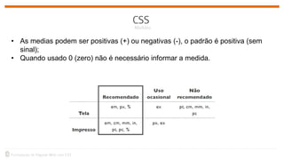 O documento discute unidades de medida em CSS, dividindo-as em relativas e absolutas. As unidades relativas incluem em, rem, ex, px e %, enquanto as absolutas são pt, pc, mm, cm e in. É explicado que as unidades relativas se referem a outras medidas enquanto as absolutas não.