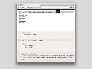 O documento aborda a compatibilidade de CSS com navegadores antigos, especialmente o Internet Explorer 7 e 8, discutindo propriedades como display, opacity e seletores avançados. Ele detalha a utilização de pseudo-elementos e contextos de formatação, além de apresentar o clearfix e técnicas para lidar com floats. Links e referências úteis são fornecidos para aprofundamento no tema.