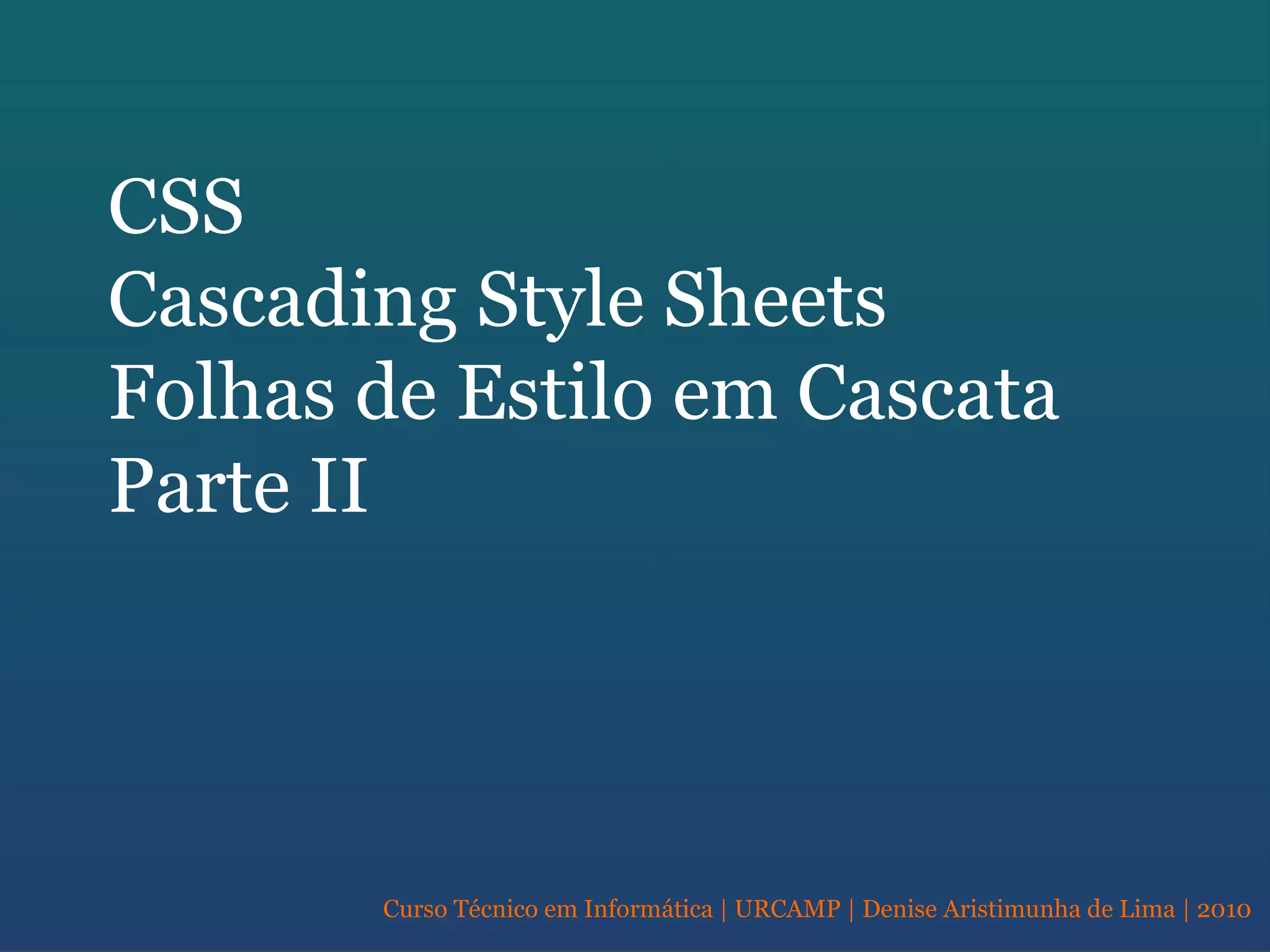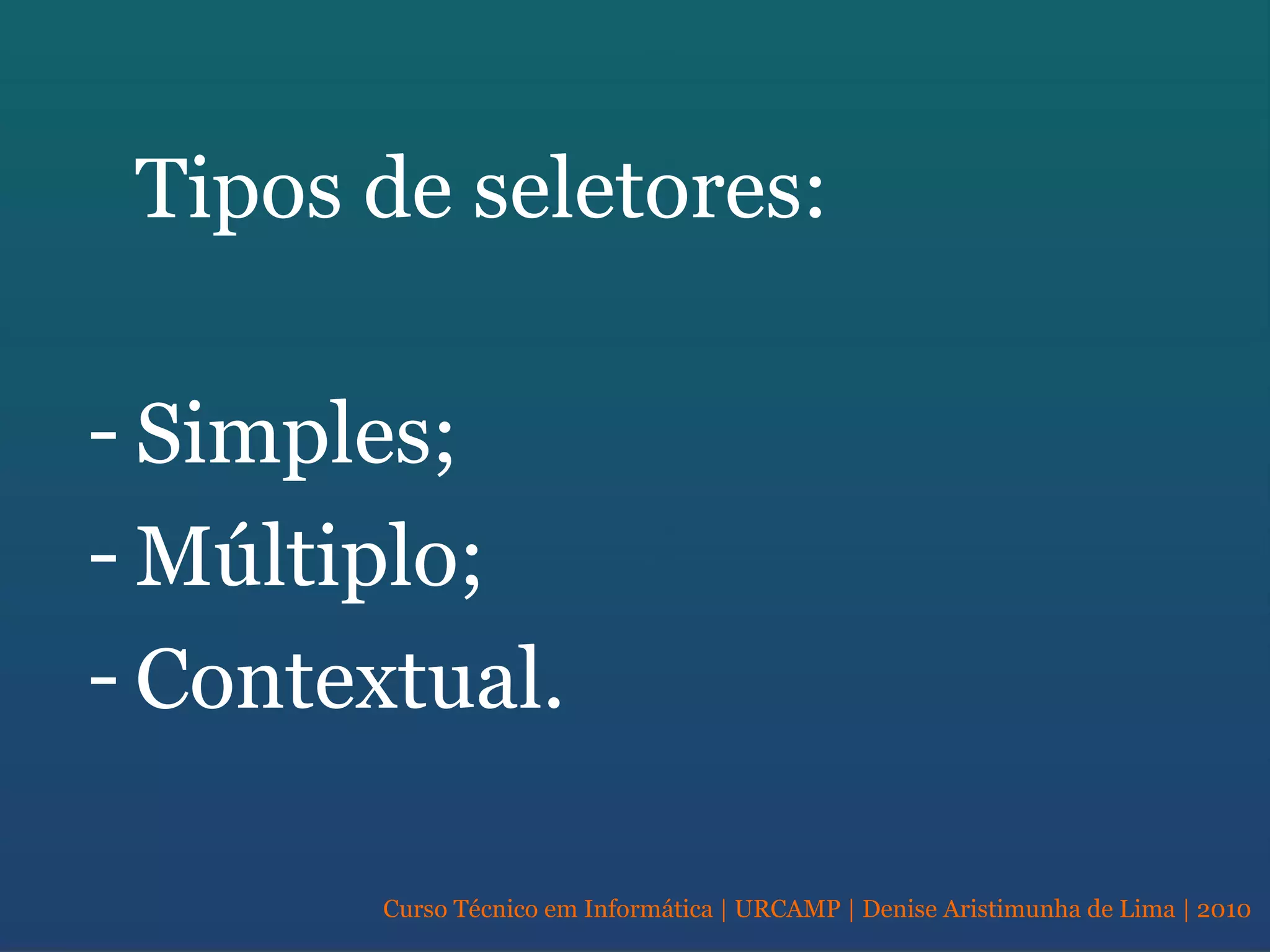 O documento discute os principais tipos de seletores CSS, incluindo seletores simples, múltiplos e contextuais. Também aborda o atributo class, herança, encadeamento, unidades de medida e propriedades para formatação de fontes, cores e fundos.