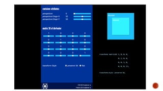 O documento discute propriedades de transformações 3D e transições no CSS3. Apresenta exemplos de como aplicar rotações, translações e escalas 3D, além de definir perspectiva, backface-visibility, timing functions e delays em transições.